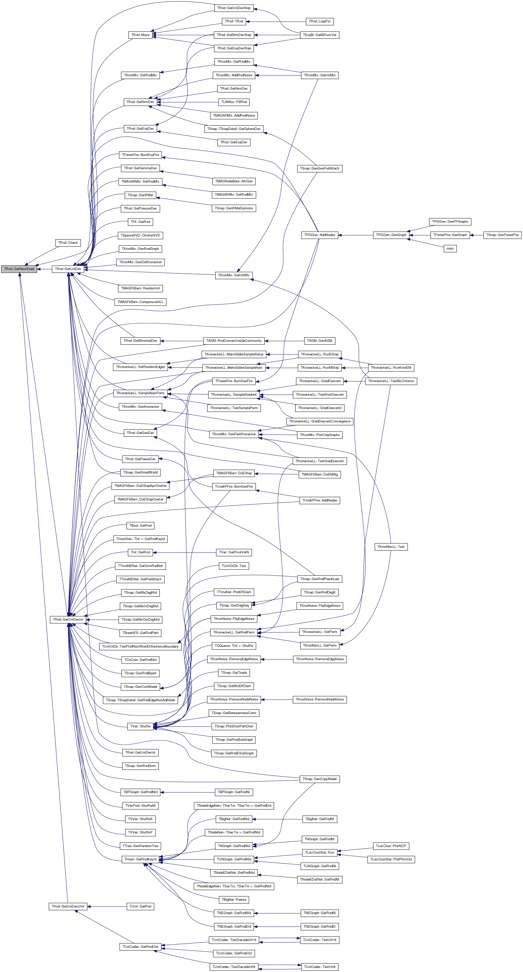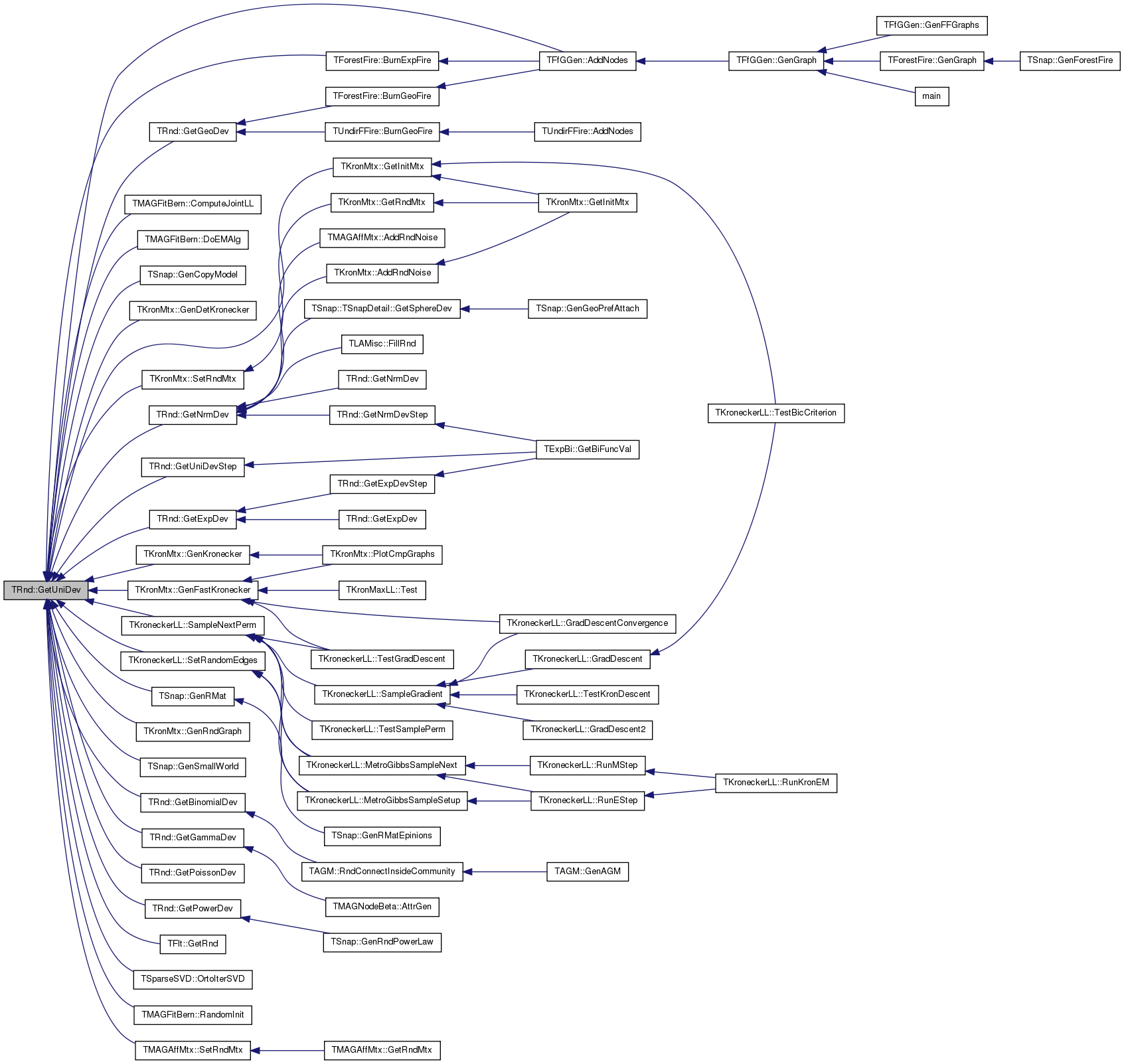 Referenced by TFfGGen::AddNodes(), TForestFire::BurnExpFire(), TMAGFitBern::ComputeJointLL(), TMAGFitBern::DoEMAlg(), TSnap::GenCopyModel(), TKronMtx::GenDetKronecker(), TKronMtx::GenFastKronecker(), TKronMtx::GenKronecker(), TSnap::GenRMat(), TKronMtx::GenRndGraph(), TSnap::GenSmallWorld(), GetBinomialDev(), GetExpDev(), GetGammaDev(), GetGeoDev(), TKronMtx::GetInitMtx(), GetNrmDev(), GetPoissonDev(), GetPowerDev(), TFlt::GetRnd(), GetUniDevStep(), TSparseSVD::OrtoIterSVD(), TMAGFitBern::RandomInit(), TKroneckerLL::SampleNextPerm(), TKroneckerLL::SetRandomEdges(), TMAGAffMtx::SetRndMtx(), and TKronMtx::SetRndMtx().