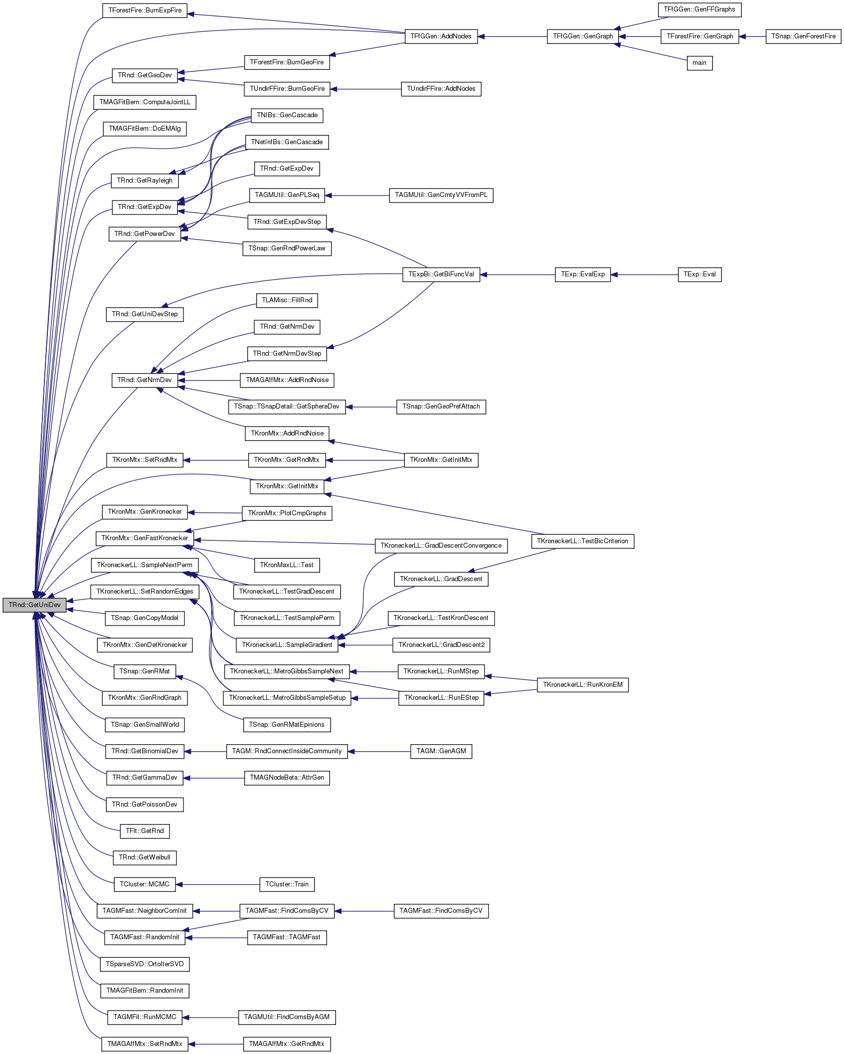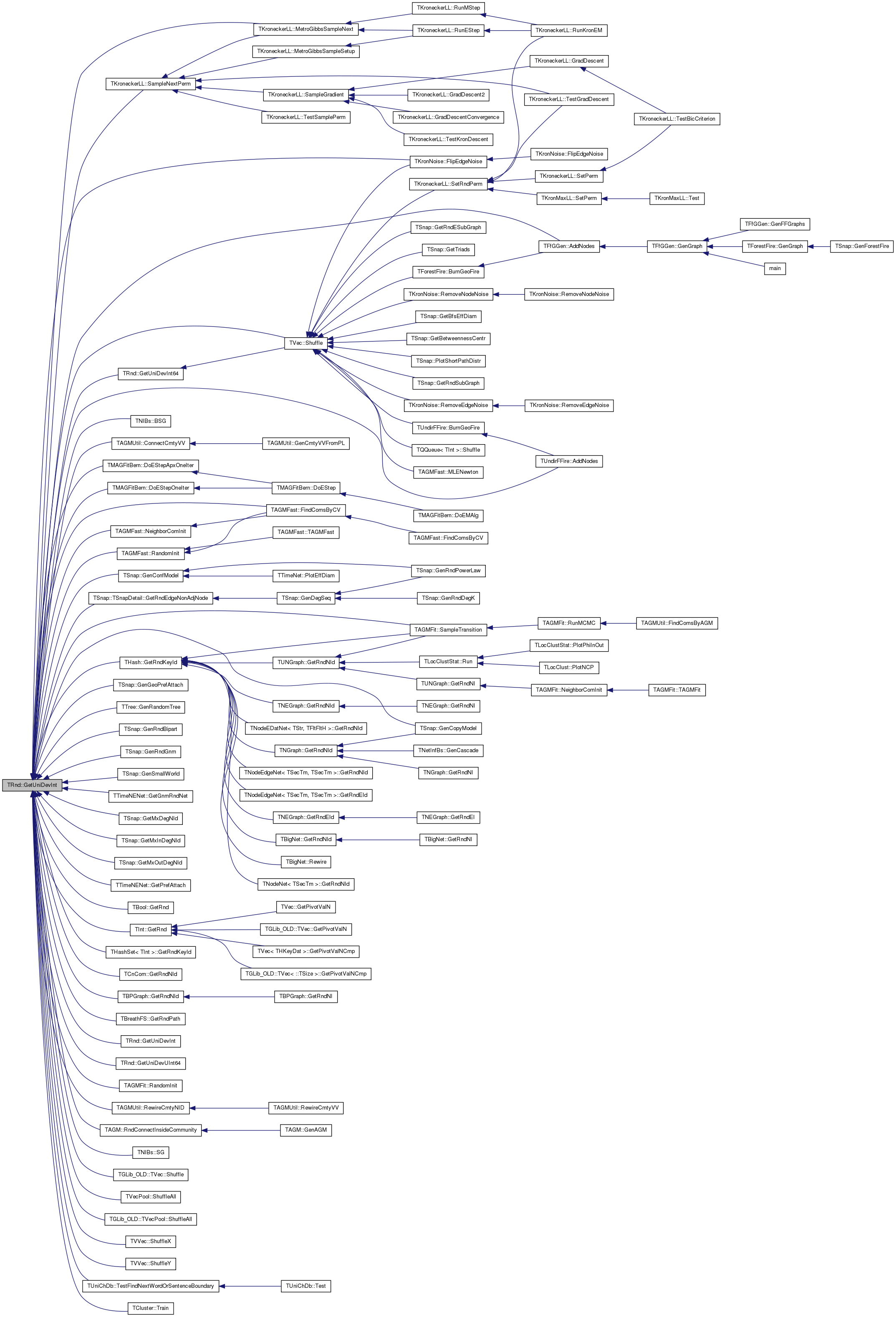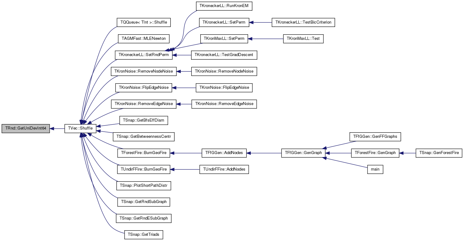 Referenced by TFfGGen::AddNodes(), TUndirFFire::AddNodes(), TNIBs::BSG(), TAGMUtil::ConnectCmtyVV(), TMAGFitBern::DoEStepApxOneIter(), TMAGFitBern::DoEStepOneIter(), TAGMFast::FindComsByCV(), TKronNoise::FlipEdgeNoise(), TSnap::GenConfModel(), TSnap::GenCopyModel(), TSnap::GenGeoPrefAttach(), TTree< TVal >::GenRandomTree(), TSnap::GenRndBipart(), TSnap::GenRndGnm(), TSnap::GenSmallWorld(), TTimeNENet::GetGnmRndNet(), TSnap::GetMxDegNId(), TSnap::GetMxInDegNId(), TSnap::GetMxOutDegNId(), TTimeNENet::GetPrefAttach(), TBool::GetRnd(), TInt::GetRnd(), TSnap::TSnapDetail::GetRndEdgeNonAdjNode(), THash< TKey, TDat, THashFunc >::GetRndKeyId(), THashSet< TInt >::GetRndKeyId(), TCnCom::GetRndNId(), TBPGraph::GetRndNId(), TBreathFS< PGraph >::GetRndPath(), GetUniDevInt(), GetUniDevInt64(), GetUniDevUInt64(), TKroneckerLL::MetroGibbsSampleNext(), TAGMFast::NeighborComInit(), TAGMFast::RandomInit(), TAGMFit::RandomInit(), TAGMUtil::RewireCmtyNID(), TAGM::RndConnectInsideCommunity(), TKroneckerLL::SampleNextPerm(), TAGMFit::SampleTransition(), TNIBs::SG(), TVec< TVal, TSizeTy >::Shuffle(), TGLib_OLD::TVec< TVal >::Shuffle(), TVecPool< TVal, TSizeTy >::ShuffleAll(), TGLib_OLD::TVecPool< TVal >::ShuffleAll(), TVVec< TVal >::ShuffleX(), TVVec< TVal >::ShuffleY(), TUniChDb::TestFindNextWordOrSentenceBoundary(), and TCluster::Train().