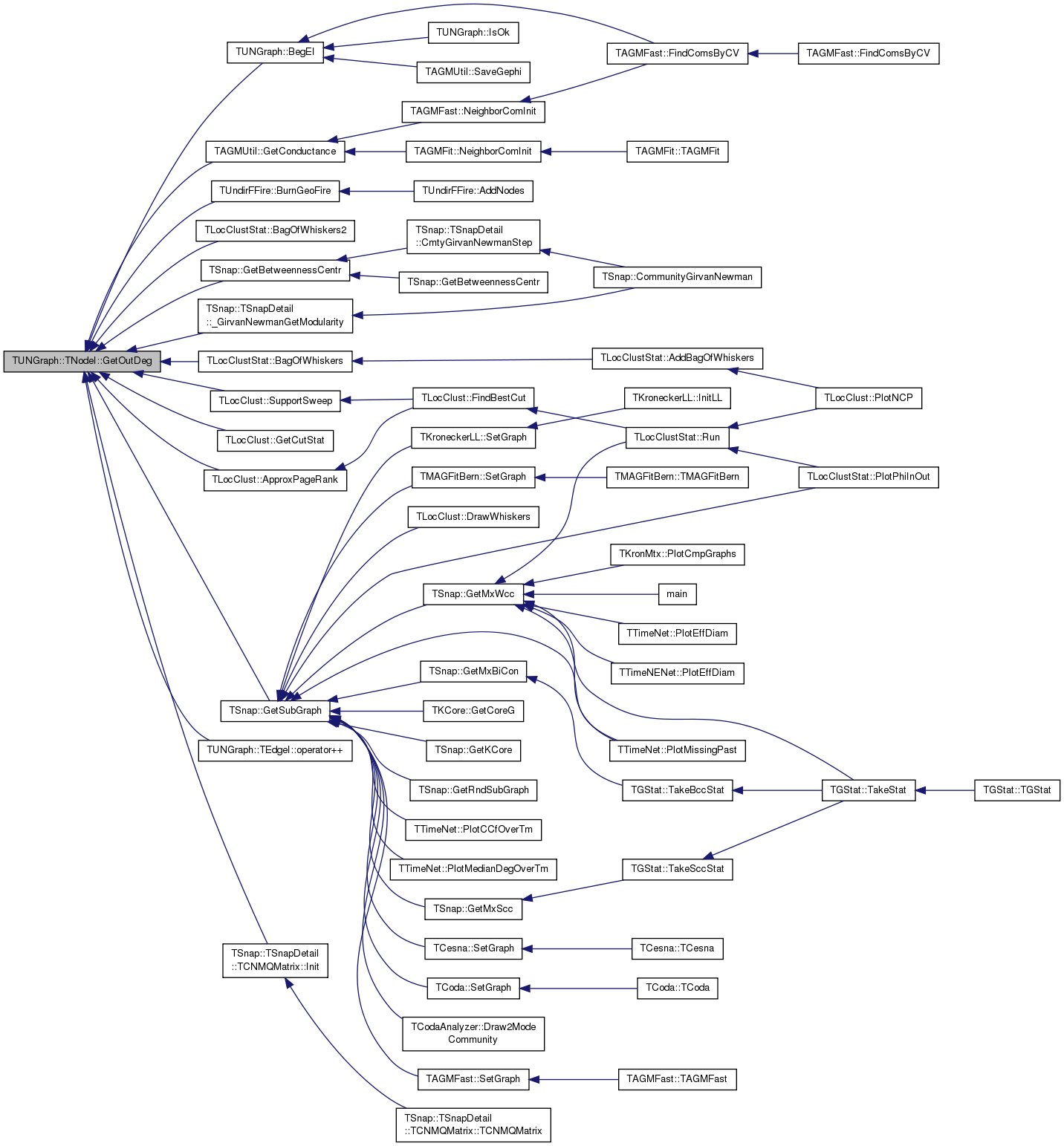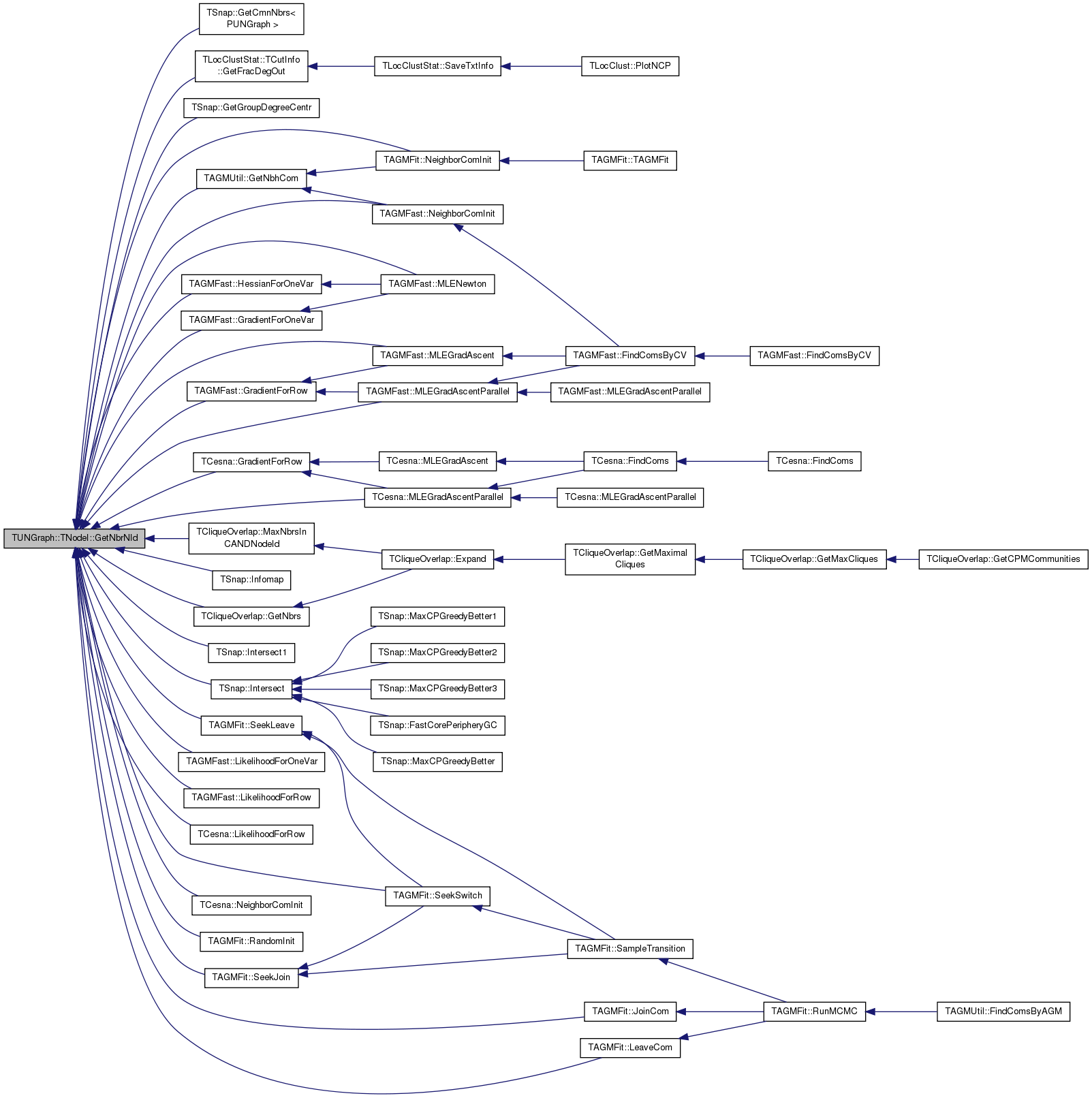 Referenced by TSnap::GetCmnNbrs< PUNGraph >(), TLocClustStat::TCutInfo::GetFracDegOut(), TSnap::GetGroupDegreeCentr(), TAGMUtil::GetNbhCom(), TCliqueOverlap::GetNbrs(), TCliqueOverlap::GetNodeIdWithMaxDeg(), TAGMFast::GradientForOneVar(), TAGMFast::GradientForRow(), TCesna::GradientForRow(), TAGMFast::HessianForOneVar(), TSnap::Infomap(), TSnap::TSnapDetail::InfomapOnlineIncrement(), TSnap::Intersect(), TSnap::Intersect1(), TAGMFit::JoinCom(), TAGMFit::LeaveCom(), TAGMFast::LikelihoodForOneVar(), TAGMFast::LikelihoodForRow(), TCesna::LikelihoodForRow(), TCliqueOverlap::MaxNbrsInCANDNodeId(), TAGMFast::MLEGradAscent(), TAGMFast::MLEGradAscentParallel(), TCesna::MLEGradAscentParallel(), TAGMFast::MLENewton(), TAGMFast::NeighborComInit(), TAGMFit::NeighborComInit(), TCesna::NeighborComInit(), TAGMFast::RandomInit(), TAGMFit::RandomInit(), TCesna::RandomInit(), TAGMFit::SeekJoin(), TAGMFit::SeekLeave(), and TAGMFit::SeekSwitch().
