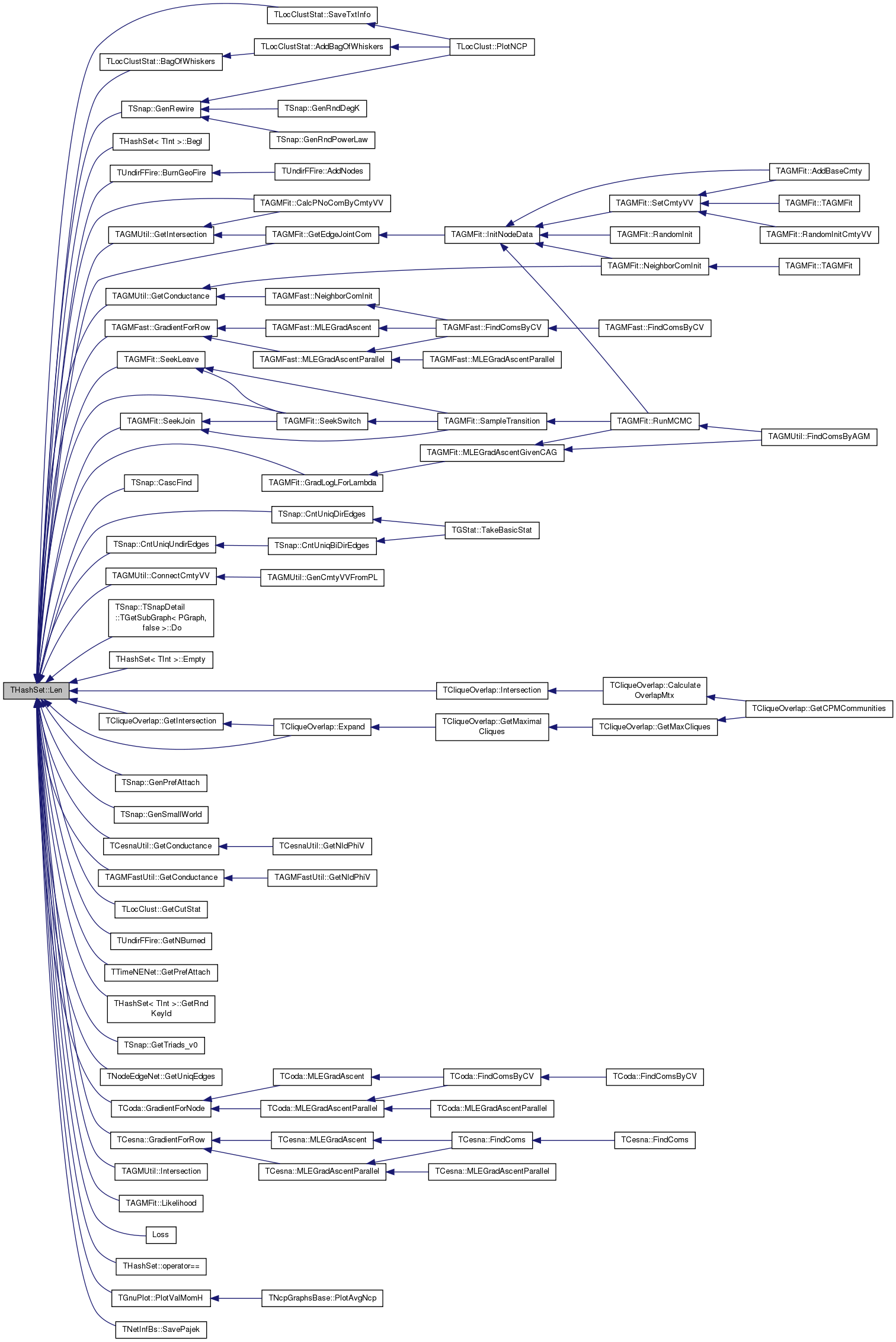 Referenced by TLocClustStat::BagOfWhiskers(), THashSet< TInt >::BegI(), TUndirFFire::BurnGeoFire(), TAGMFit::CalcPNoComByCmtyVV(), TSnap::CascFind(), TSnap::CntUniqDirEdges(), TSnap::CntUniqUndirEdges(), TAGMUtil::ConnectCmtyVV(), TSnap::TSnapDetail::TGetSubGraph< PGraph, false >::Do(), THashSet< TInt >::Empty(), TCliqueOverlap::Expand(), TSnap::GenPrefAttach(), TSnap::GenRewire(), TSnap::GenSmallWorld(), TCesnaUtil::GetConductance(), TAGMUtil::GetConductance(), TAGMFastUtil::GetConductance(), TLocClust::GetCutStat(), TAGMFit::GetEdgeJointCom(), TCliqueOverlap::GetIntersection(), TAGMUtil::GetIntersection(), TUndirFFire::GetNBurned(), TTimeNENet::GetPrefAttach(), THashSet< TInt >::GetRndKeyId(), TSnap::GetTriads_v0(), TNodeEdgeNet< TNodeData, TEdgeData >::GetUniqEdges(), TCoda::GradientForNode(), TAGMFast::GradientForRow(), TCesna::GradientForRow(), TAGMFit::GradLogLForLambda(), TCliqueOverlap::Intersection(), TAGMUtil::Intersection(), TAGMFit::Likelihood(), Loss(), THashSet< TKey, THashFunc >::operator==(), TGnuPlot::PlotValMomH(), TNetInfBs::SavePajek(), TLocClustStat::SaveTxtInfo(), TAGMFit::SeekJoin(), TAGMFit::SeekLeave(), and TAGMFit::SeekSwitch().